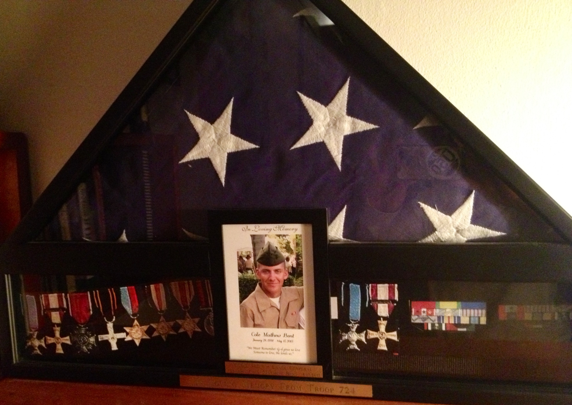 I will share a photo here, only because I intend to honor the many veterans whose bravery is incomprehensible to me. The picture is of the folded flag our family was presented at Cole’s posthumous honor ceremony, the medals are not his (those are placeholders awaiting his mom, me, to finish the shadow box presentation–a task I do not wish to accomplish as it would imply I am moving into a place of acceptance of my loss, which I am not). Yet by doing something difficult for me, facing this reality upon the shelf, I hope to honor our men and women veterans and their inspirational tenacity, their example of bravery, and in doing so honor those same qualities once held by my son.
