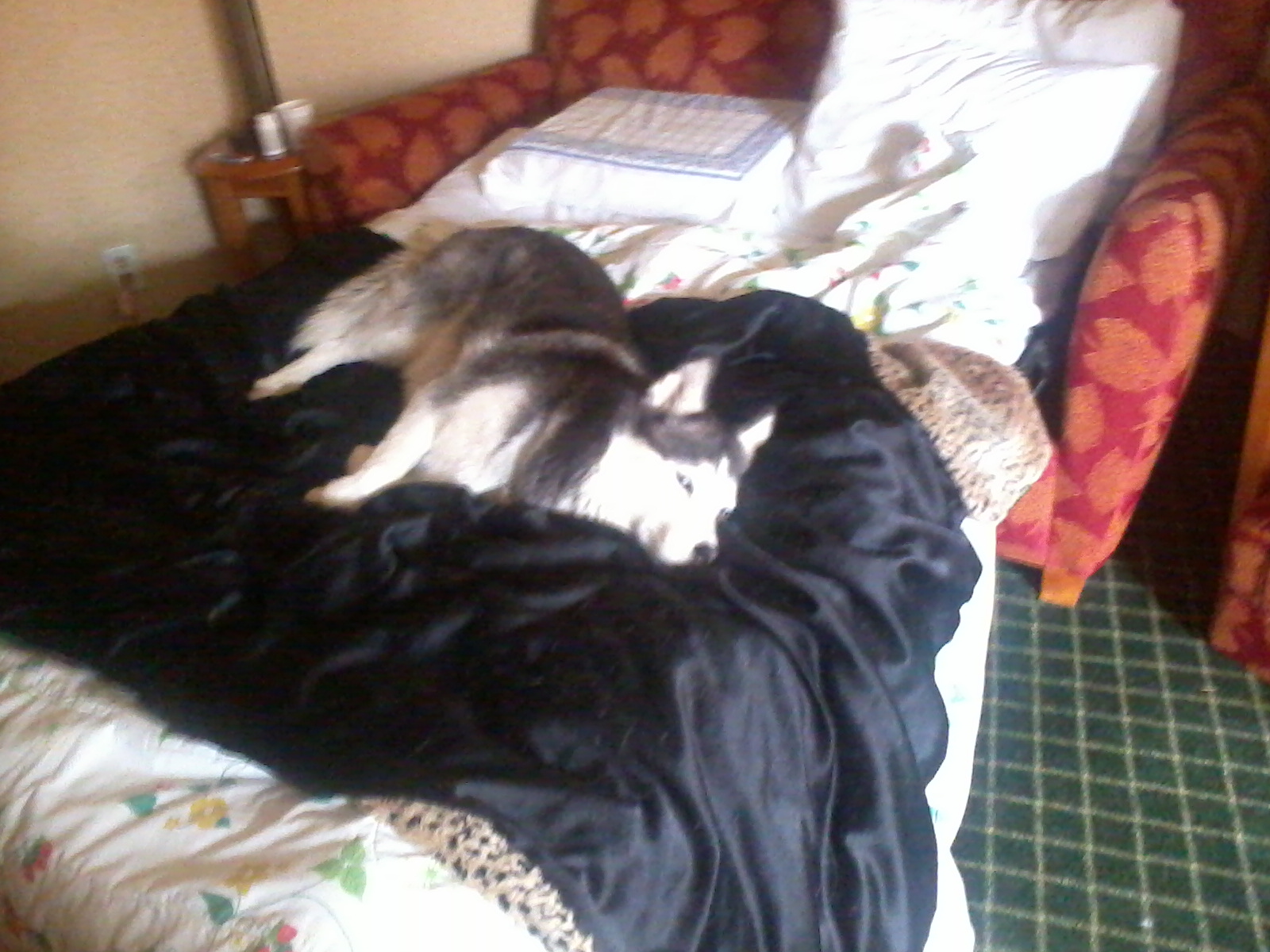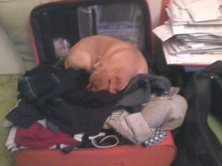 Well last night our Rose (aka Esther), spent the night at a friend’s house.  And since Buddy has a pillow bed in our living-room, which houses him quite cozily, I left him sleeping peacefully there as Brian and I turned in for the night.  This morning when I awoke and came out to start my morning routine I noticed that Buddy wasn’t on his pillow.  So naturally I checked Esther’s bed…no trace of Buddy.  I returned to my bedroom to mention the missing-in-action situation to Brian (who was still enjoying the warmth and comfort of my three down comforter’s and additional two cotton blankets which are standard on our bed–not a favorite of Brian’s but he was enjoying them just the same), when I noticed something odd lying in my, still packed from San Jose, suitcase.  It was Buddy, of course, sleeping soundly on my wool Pendelton skirt and satin slip.  Perhaps I should have unpacked earlier in the week, regardless, Buddy was content and it makes for a cute photo (especially since the newest canine member of our household is so good at commanding the majority of our attention).  And since I am sitting here at Mission Hospital as Cole is in having his MRI’s I thought I would share a ‘sweet nothing’ with you.  Happy Saturday.